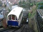 The gradient of 1 in 1.8 makes it the steepest funicular railway in the country. The red spots on the photograph are just a reflection of the Christmas tree lights in the bottom station.