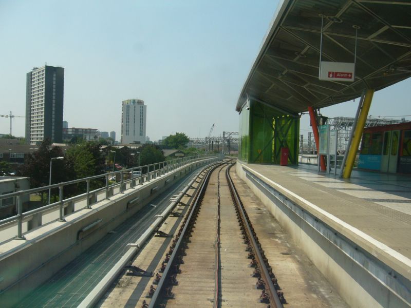 The westbound Docklands Light Railway platform at Canning Town station, where the DLR, Jubilee Line and, until 9th December 2006, the National Rail North London Line all meet. Services to King George V and Beckton depart from this platform, the Jubilee Line is directly below and the North London Line station is below left, between the Jubilee Line and busses.