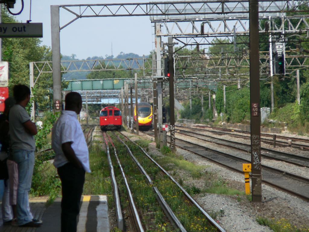 A northbound Virgin West Coast Class 390 Pendolino 25kv AC OHL EMU passes a southbound London Underground 1972-stock 630v DC fouth-rail EMU just north of South Kenton station on the Bakerloo Line.