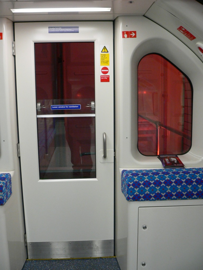 The mockup of the London Underground 2009 stock, which will replace the existing 1967 stock on the Victoria Line, was open to public viewing in a marquee in Euston Square Gardens for a couple of weeks in early August. The view inside the doorway when the door is closed. The black circle iluminates a warning when the door is opening or closing.