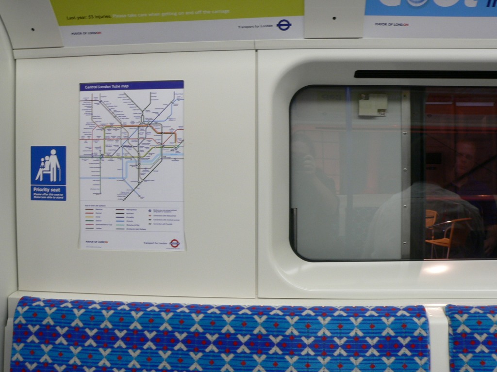 The mockup of the London Underground 2009 stock, which will replace the existing 1967 stock on the Victoria Line, was open to public viewing in a marquee in Euston Square Gardens for a couple of weeks in early August. This shows the map pannel and window end viewed when the door is open.