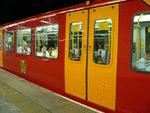 The interior of Tyne and Wear Metro train 4067 as it stands at Manors station. The green light on the doors indicates that they are unlocked, and that passengers can push the button immediately below to alight from the train. Photo by Chris McKenna 07/03/2005. |