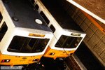 Rebuilt prototype Tyne and Wear Metro train 4001 in original livery (yellow and white with a maroon stripe) at Pelaw station with a Yellow line train to South Hylton.