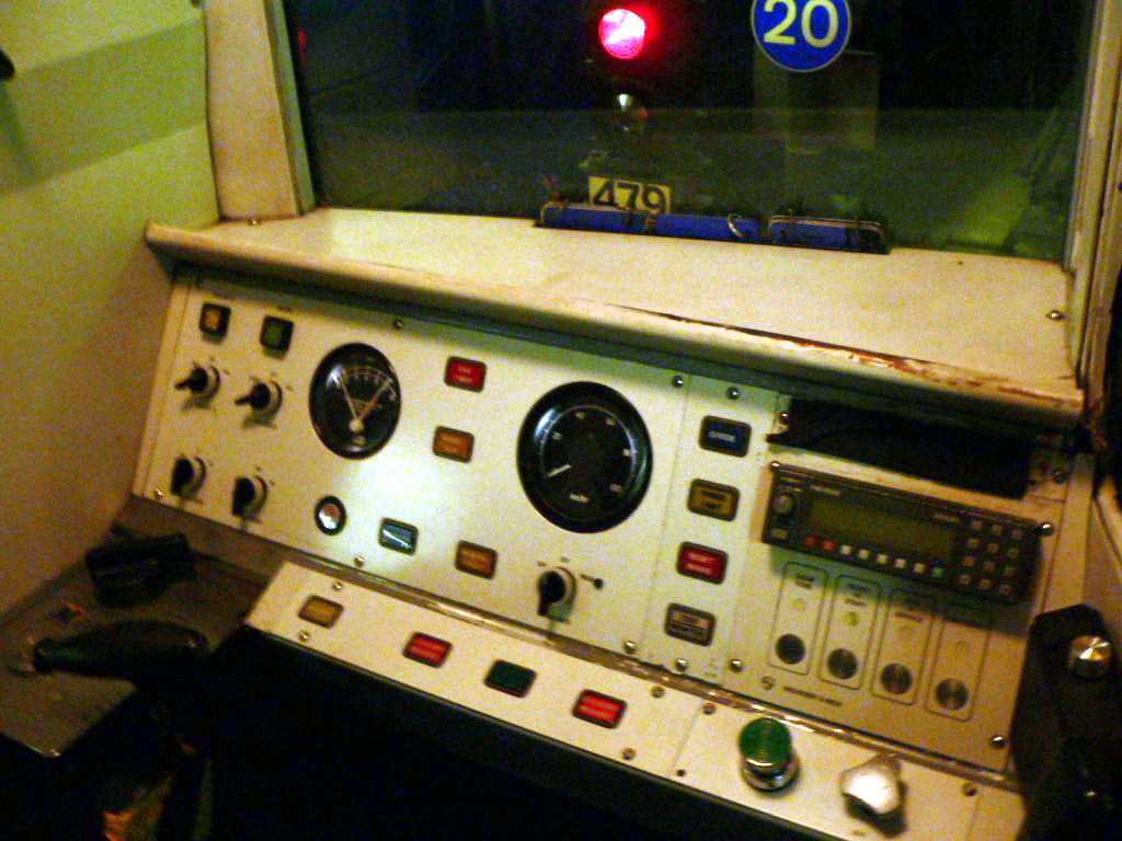 The drivers desk of a Tyne and Wear Metro train at St James station. The speedometer in the centre of the desk is calibrated only in km/h and goes up to 100 km/h, although the highest linespeed on the system is 80km/h I believe.