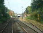 The view through the rather grubby front window of Tyne and Wear Metro train 4089 as it arrives at Shiremoor station. The amount of vegetation between and beside the rails ahead suggest a much less frequent service than the 6 trains per hour that serve this station in both directions during the peak.