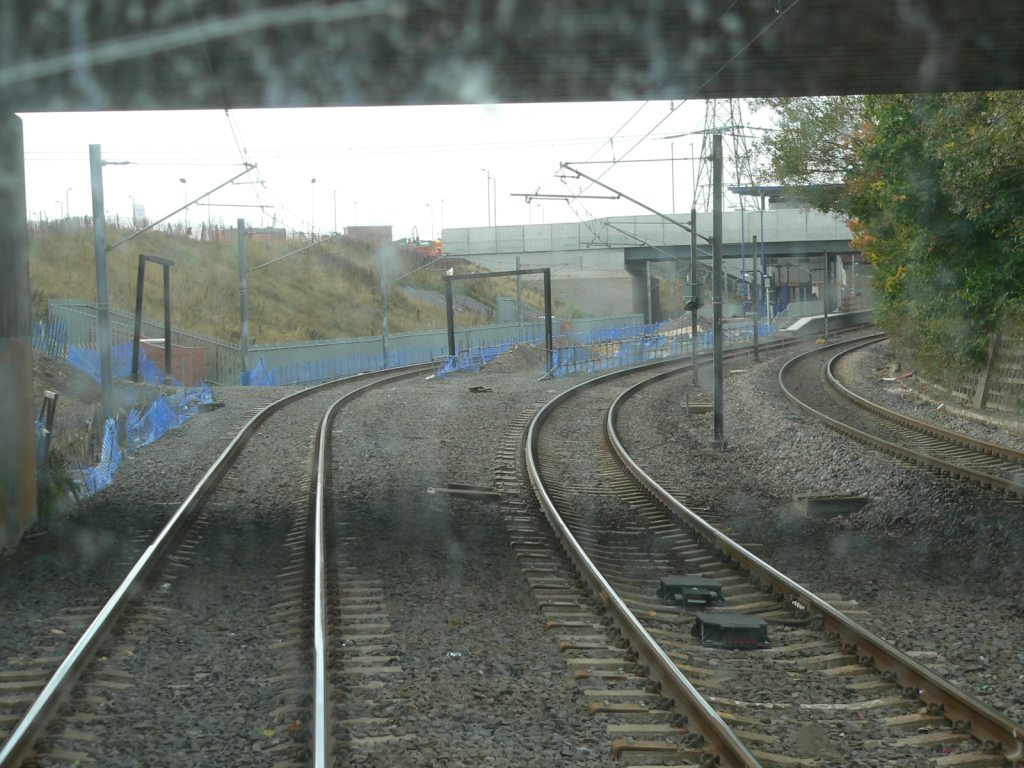 The view through the rather grubby front window of Tyne and Wear Metro train 4089 as it approaches the site of the under construction Northumberland Park station between Shiremoor and Palmersville. Originally due to open this month (October 2005) this view shows there is still much work to be done.