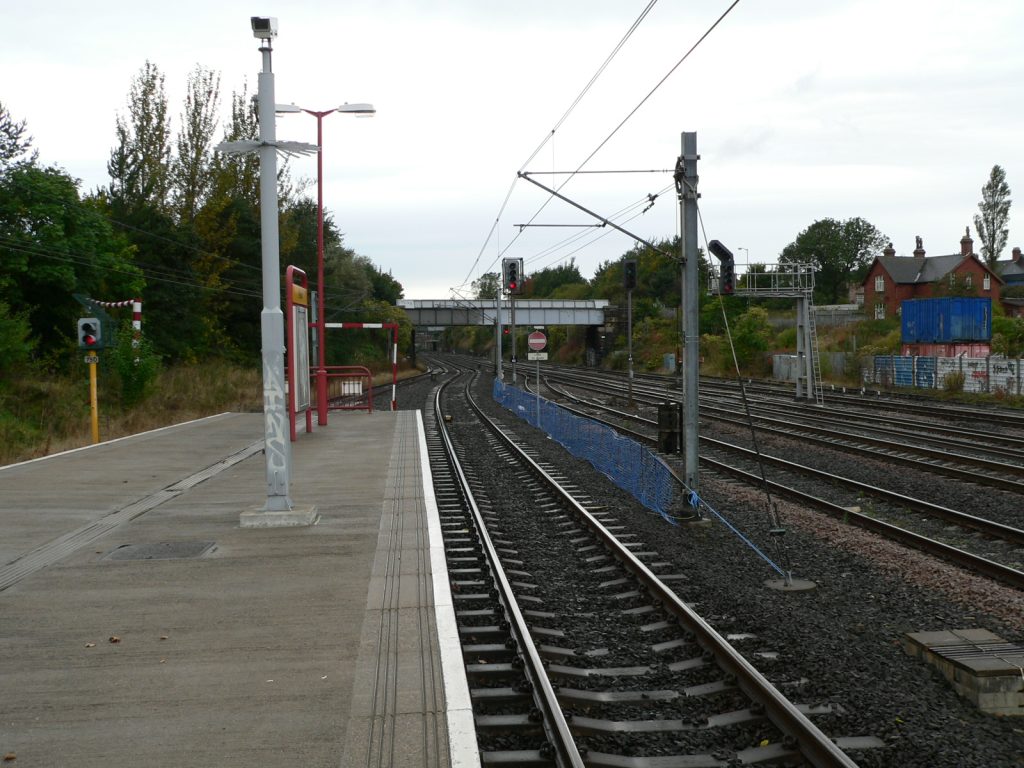 Pelaw Tyne and Wear Metro station, looking west along the eastbound platform. This station is the southern diverging point of the Green and Yellow lines, with the former continuing to South Shields and the latter over tracks shared with mainline trains to Sunderland and then onwards to South Hylton. Prior to the opening of the Sunderland extension in 2002, this was the terminus of the yellow line and it is still used as a reversing point for several services a day with trains emptying here and running empty into sidings at the east end of the station. The tracks to the right of the picture are the Network Rail mainlines between Newcaslte and Sunderland, which are still fully segregated from the Metro at this point, the systems merge at a newly constructed junction southeast of the station.