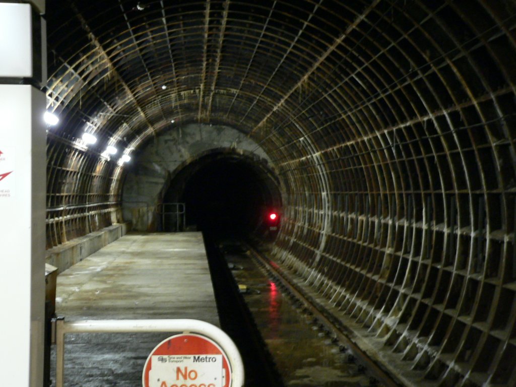 The overrun tunnel at St James station, the terminus of the Tyne and Wear Metro Yellow line. This shows how all the stations were originally constructed for trains of three two-car units, but economies imposed meant that the system operates trains of two two-car units only.
