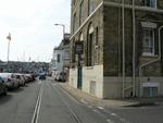 Looking west along Custom House Quay from point 54 on the map. The raised platform on the left, behind the parked cars, is the former goods loading area and one of only two stretches of double tracking on the entire branch; although the rails closest to the platform have been tarmaced over.