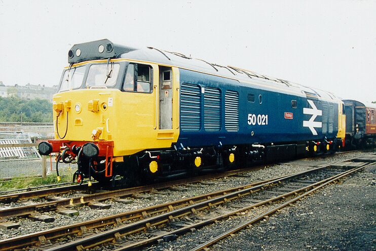 B&KR/SRPS Class 50. 50021 'Rodney' stands outside the loco shed at Bo'Ness on the Bo'Ness & Kinneil Railway on Saturday 4th September 1999.