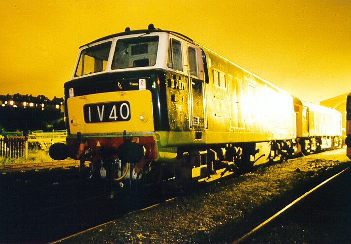Class 35 'Hymek'. Just before i retired for the night to my makeshift bed on the floor of the Swindon Class 126 unit using seat cushions & a sleeping bag, i nipped out to get night shot of D7076. As with the above shot, this shot was taken using the same settings but from the other side into the glow of the yard light. With the yard light bouncing off both loco's, D7076 is captured standing with 25235 at Bo'Ness on Thursday 3rd Sept 1998 at 23:00.
