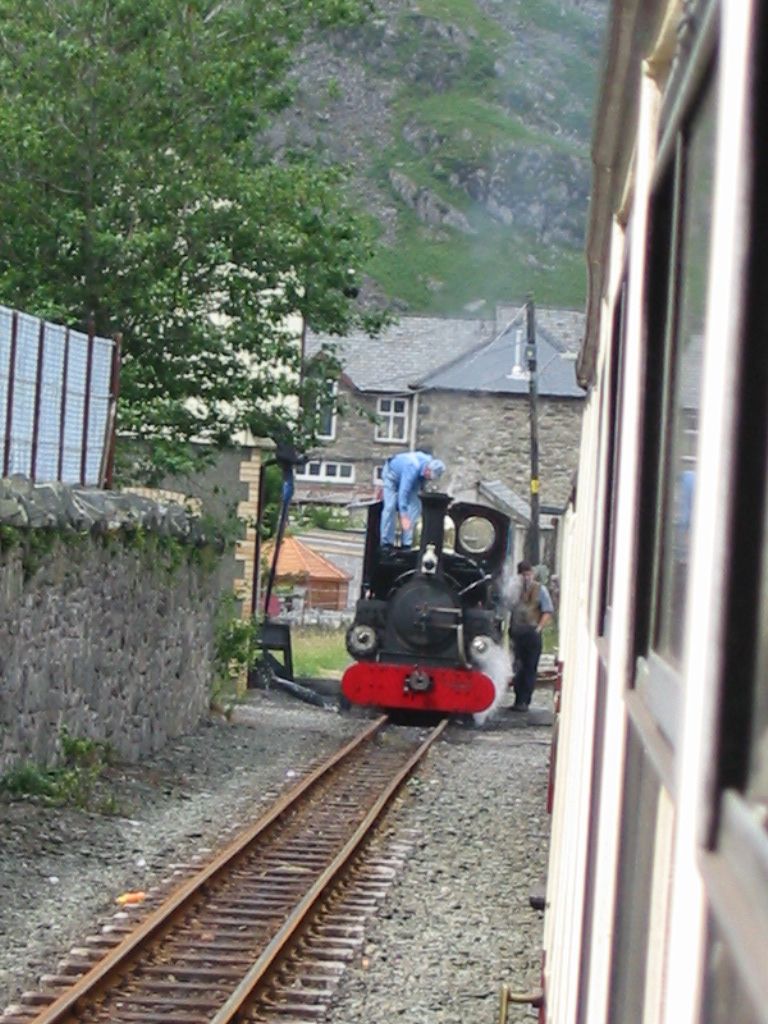 | Ffestinog Railway steam locomotive Linda runs around the train in preparation for the return journey to Porthmadog. Chris McKenna 18/06/2004 |