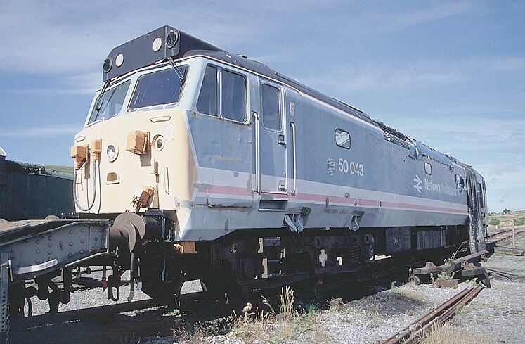 Class 50. Faded Network South East (NSE) liveried 50043, which was formerly named 'Eagle', stands at Blaenavon on the Pontypool & Blaenavon Railway while awaiting eventual restoration on Sunday 12th September 1999.