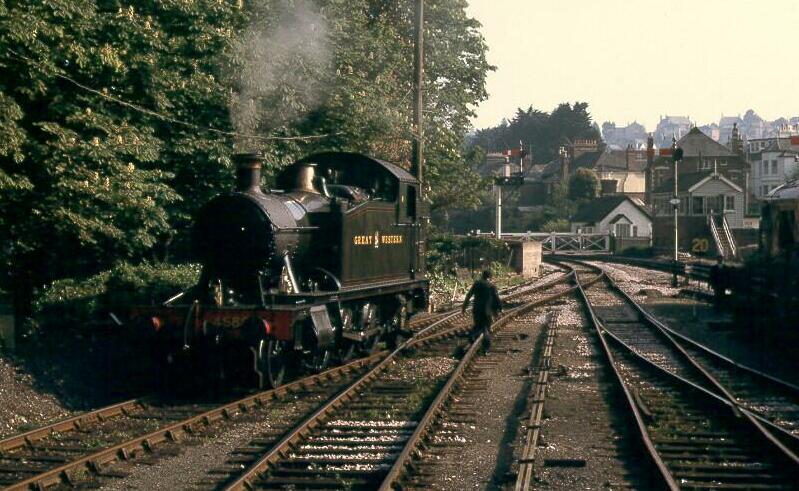 Paignton & Dartmouth Railway. GWR 4588 2-6-2T passes Goodrington Sands in June 1973. The BR carriage sidings are on the left and the beach is on the right. The tank has just passed onto the single track that ran all the way to Paignton.
