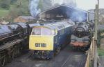 SVR Class 52. D1013 'Western Ranger' stands in the company of 45110, an LMS Class 5MT & 80080, BR Class 4MT at Bridgenorth loco shed on the Severn Valley Railway on Saturday 16th October 1999.