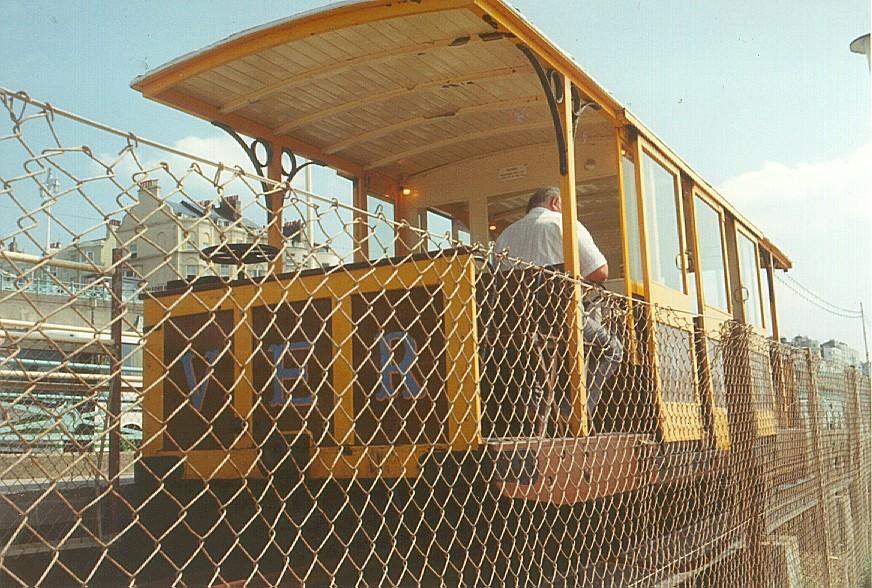 Volk's Electric Railway, eine der ältesten elektrischen Bahnen in England verkehrt heute noch im Linienbetrieb an der Küste in Brighton. Volk's Electric Railway, one of the oldest electric railways in Britain is still in service at the coastline in Brighton.
