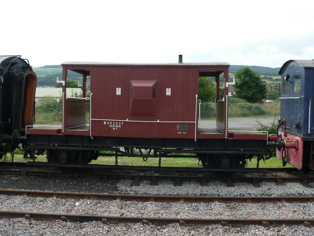 BR 20 ton Goods Brake Van no. B 952527. Built by BR Faversham in 1954 under Lot 2606, to Diagram 1/506. Formerly fitted with vacuum brakes. Acquired by D&EPG from the Paignton & Dartmouth Steam Railway in 2004. This van underwent extensive refurbishment by the DEPG at Williton in 2004, and now carries fitted freight bauxite livery. Photographed in the sidings at the eastern end of Minehead station on the West Somerset Railway.