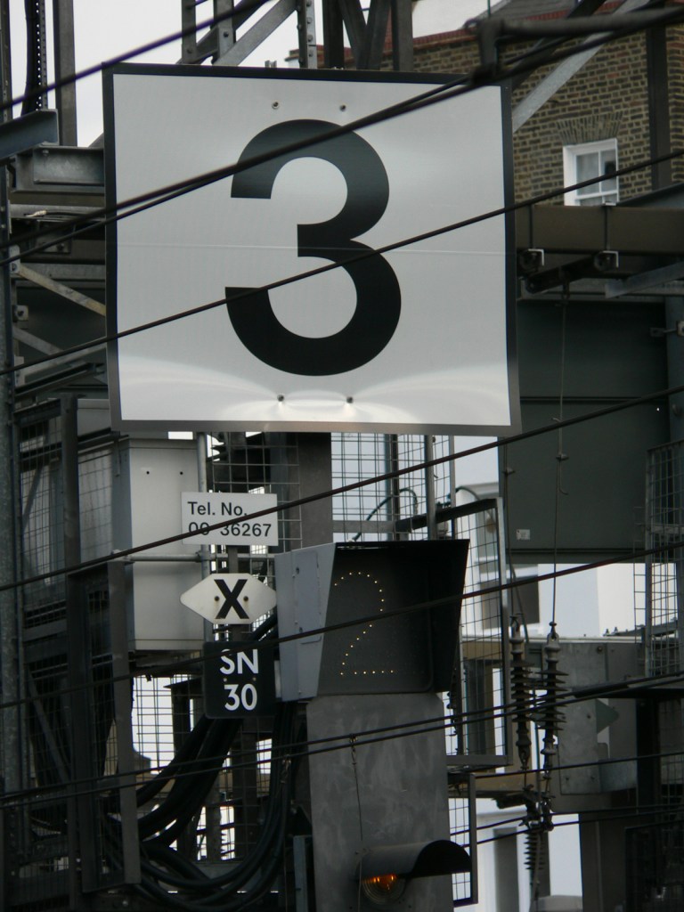 Signal SN30, located adjacent to Royal Oak London Underground station, on the approach to London Paddington. Like the other signals on this gantry it is capable of display only danger (red) and caution (yellow) aspects, the latter in conjunction with a route indicator. The route indicator displayed here, 2, indicates that the next train to pass this signal will be terminating at platfrom 2 at Paddington station. The large "3" above the signal indicates this is the signal for line 3. I beleive these signs are a legacy of the Ladbroke Grove rail crash where the identification and sighting of signal SN109 was a key factor.