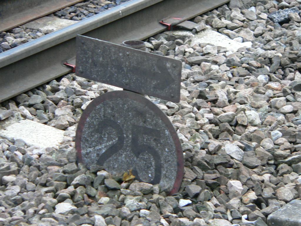 A very grubby speed restriction sign limiting trains heading into the goods loop immediately south of Highbridge & Burnham railway station in Somerset from the north to 25 miles per hour.
