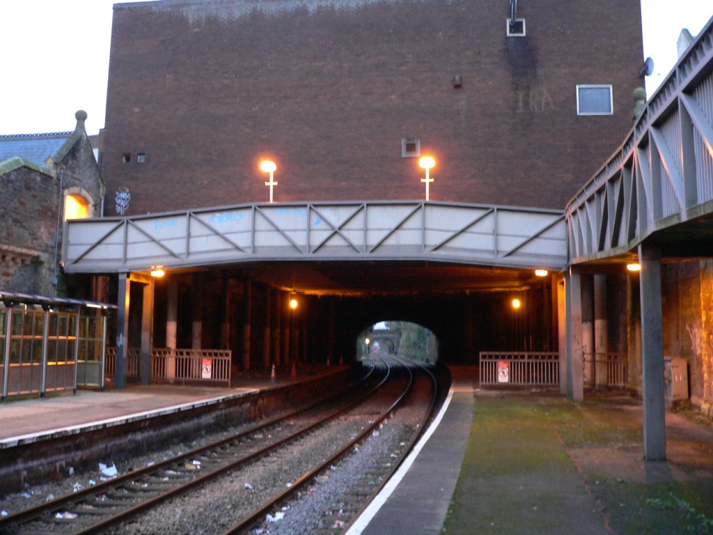 Clifton Down railway station in the Clifton area of Bristol is the main passing place on the otherwise single-tracked Severn Beach Line. This photo shows the eastern end of the station and the tunnel under the shopping centre and Whiteladies Road east of the station, photographed from the eastbound platform.
