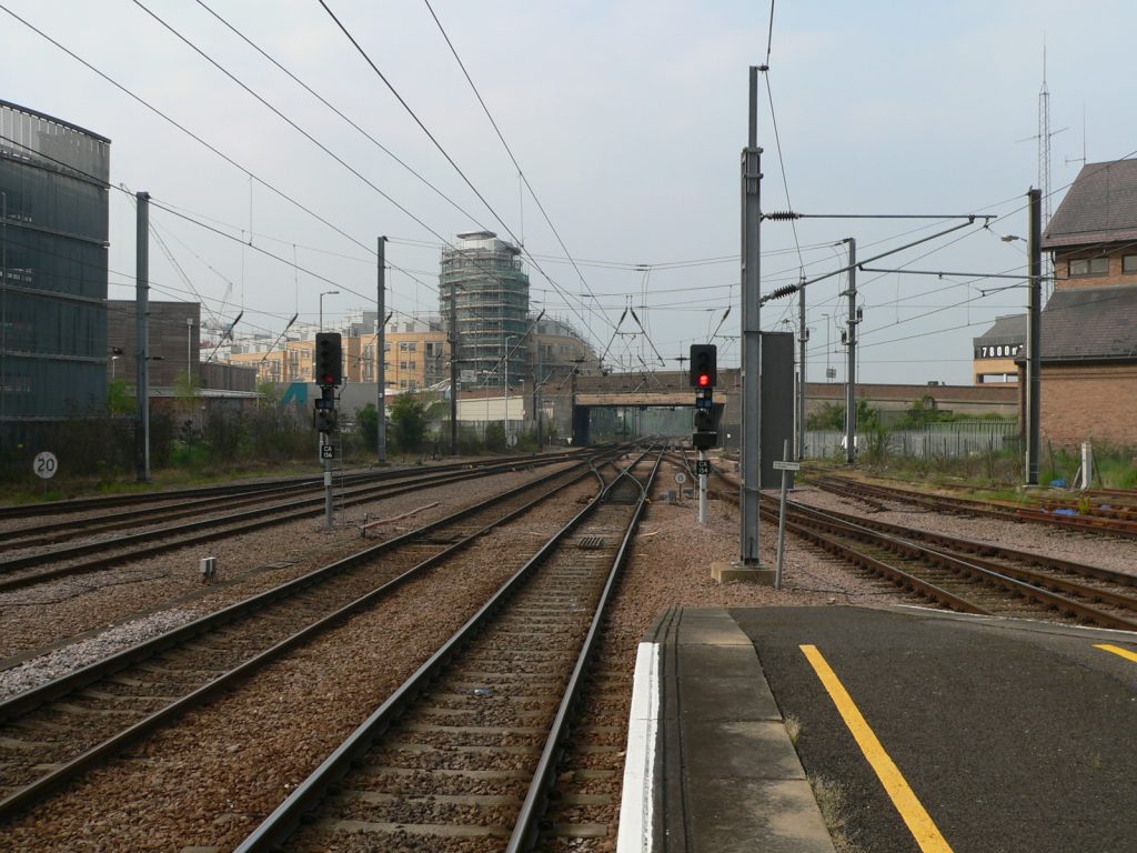 Cambridge railway station has a very unusual layout, with the platforms approximately resembling a capital H - to the left of the left vertical stroke is the station car park, booking hall, etc. There are two bay platforms in the area between the two vertical strokes at both northern and southern ends, platforms 2 and 3 at the south end and 5 and 6 at the north. All the way along the right vertical stroke is a single platform face - the second longest in Britain (after Gloucester) - that is split into two numbered platforms (1 at the southern end and 4 at the northern) which are then subdivided into 1a, 4b, etc. There are several sets of points that allow access between this line and the lines adjacent at multiple places. This photograph is looking south from platform 1, about level with the headwalls of the southern bay platforms (2 and 3), the train visible on the right is a First Capital Connect Class 365 EMU which will shortly form an express service to London Kings Cross.