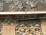A joint between two lengths of bullhead rail at Cardiff Bay railway station.