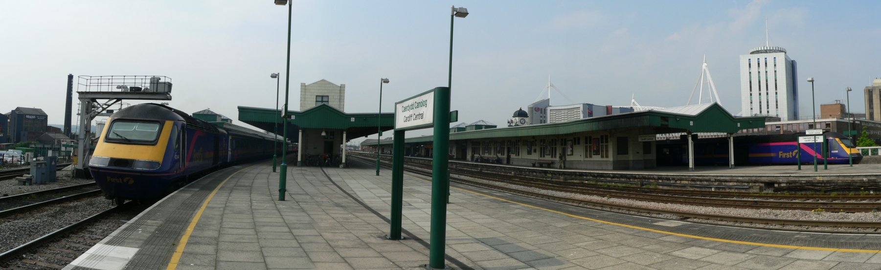 A merged view looking east at the western end of Cardiff Central railway station. A First Great Western HST is visible straigh ahead in platform 4; A FGW Class 158/9 DMU (likely 158966) is visible is on the left at platform 3. The wide span of the platform and canopy on the left (platforms 3/4) compared to the right (platforms 6/7) belies the former location of the now-missing platform 5 - a westfacing bay platform.