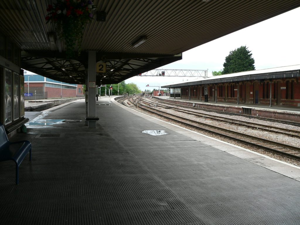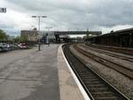 Looking west from about the centre of the main concourse building at Gloucester station, platform 3 is the bay platform on the left, platform 2 is the through platform in the centre/right of the photo while platform 4 on the far right is another through platform.