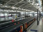 A merged view of the western end of Leeds station. The terminal platforms (6 and lower) can be seen to the left, while the through platforms are to the right. From left to right the trains visible in this picture are a GNER Mark 4 DVT, a Northern Class 158 and a Northern Class 144.