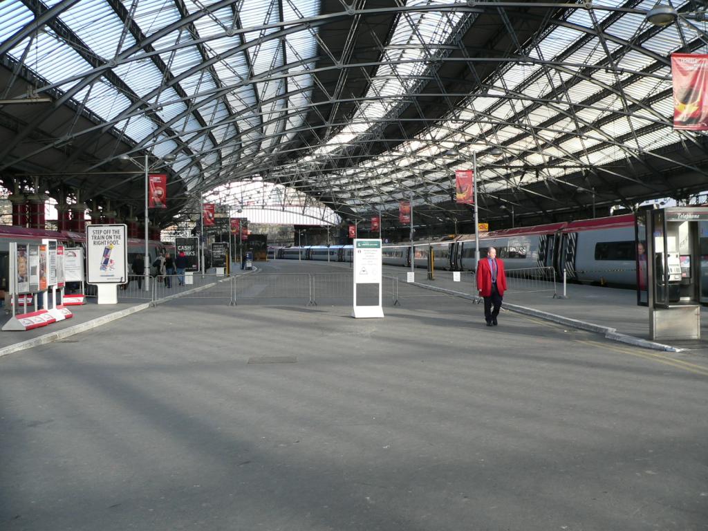 The southern part of the concourse at Liverpool Lime Street railway station. In complete contrast to the crowded retail space of the northern concourse this area is spavious and set aside almsost entireley to trains.