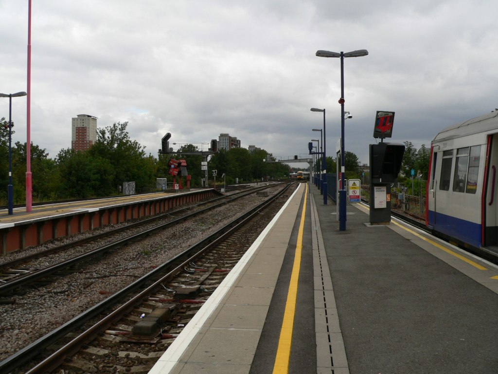 The northern end of New Cross station in South London, viewed from platform C. On the right at platform D is the northern end of a London Underground East London Line 'A' stock EMU. Platforms A, B and C are served by National Rail services, primarily operated by Southeastern.
