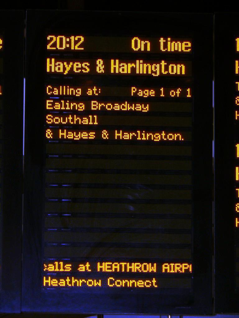 Heathrow Connect services at London Paddington are advertised as services to Hayes & Harlington. This is to encourage passengers to use the quicker, but more expensive, Heathrow Express services instead.
