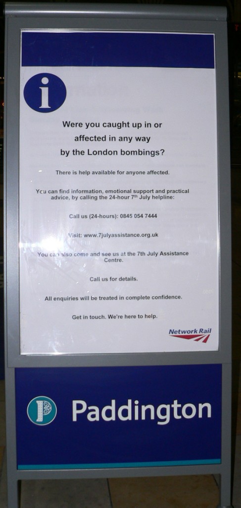 A poster on the concourse of London Paddington station offering counselling to anyone involved in or affected by the 7th July London Bombings. The information is available by calling 0845 054 7444 (+44 207 877 7492 outside the UK) or visiting http://www.7julyassistance.org.uk.