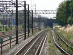 Looking south from South Kenton station in North London. The station is served by third-rail and fourth-rail DC Silverlink and London Underground Bakerloo Line trains. The mainline West Coast Main Line, electrified using 25kv AC OHLE consists of the four tracks to the left.