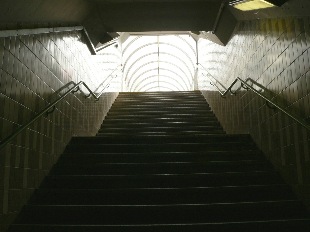The stairs to the platform from the entrance subway at South Kenton tube station on the Bakerloo Line.