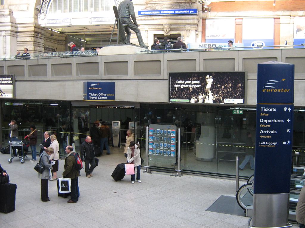 Eurostar Departures concourse (public area), looking the Travel Centre. The area marked in yellow further left is dedicated to Business Premier Ticketholders and Carte Blanche Members of Eurostar Frequent Traveller program. London-Waterloo International. 11th November 2007.