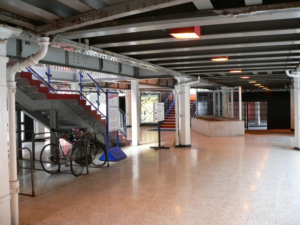 The concourse area at Portsmouth and Southsea railway station at the bottom of the stairs to the high level platforms 1 (directly overhead) and 2.