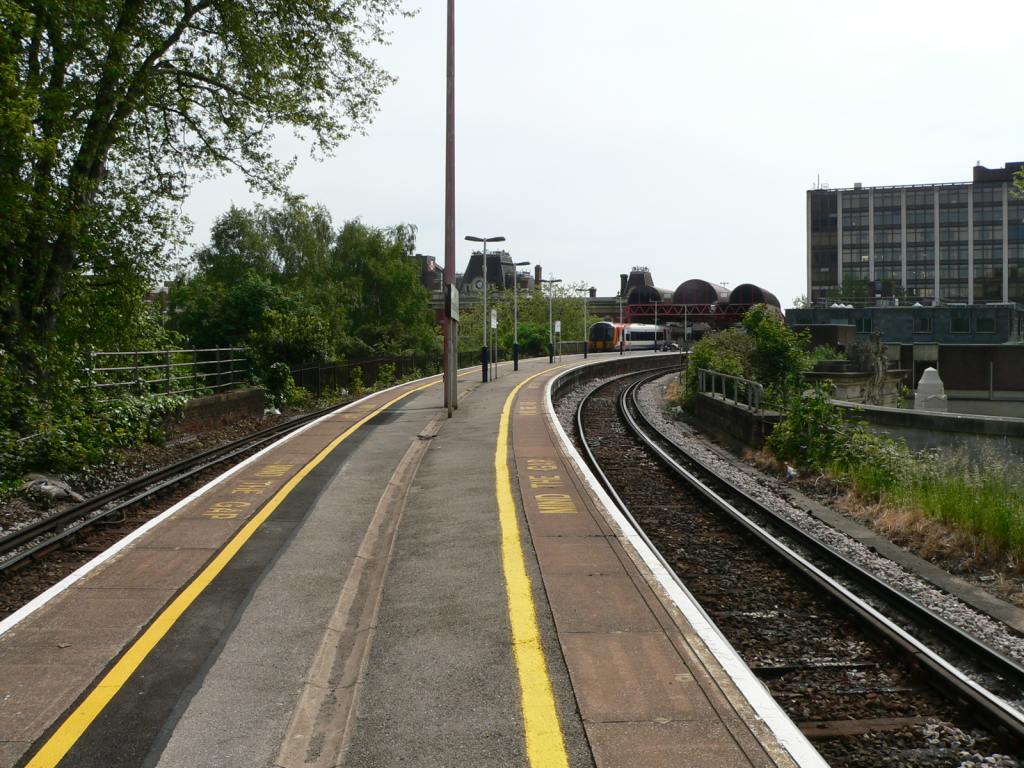 A merged view of the high level through platforms 1 and 2 at Portsmouth and Southsea railway station, looking from the western, Portsmouth Harbour, end. The main station building is behind the large tree on the left, with the low-level bay platforms behind that.