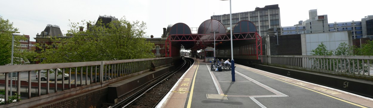 A merged view of the main front at Portsmouth and Southsea railway station. The red steel and glass bridge to the right carries the high level through platforms 1 and 2. Platforms 3 and 4, the low level bay platforms, are in line with the main station front.