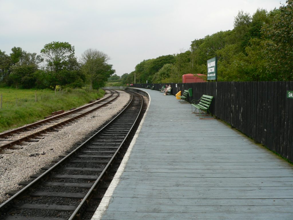 Looking south from the southern end the Isle of Wight Steam Railway platform at Smallbrook Junction station. The Island Line is behind the trees and fence to the left, with the shorter platform not extending this far south. The entire purpose of this station, constructed in 1994, is to serve as an interchange between the two railways. There is no road or footpath access so the station is open only when both Island Line and Isle of Wight Steam Railway trains are operating.