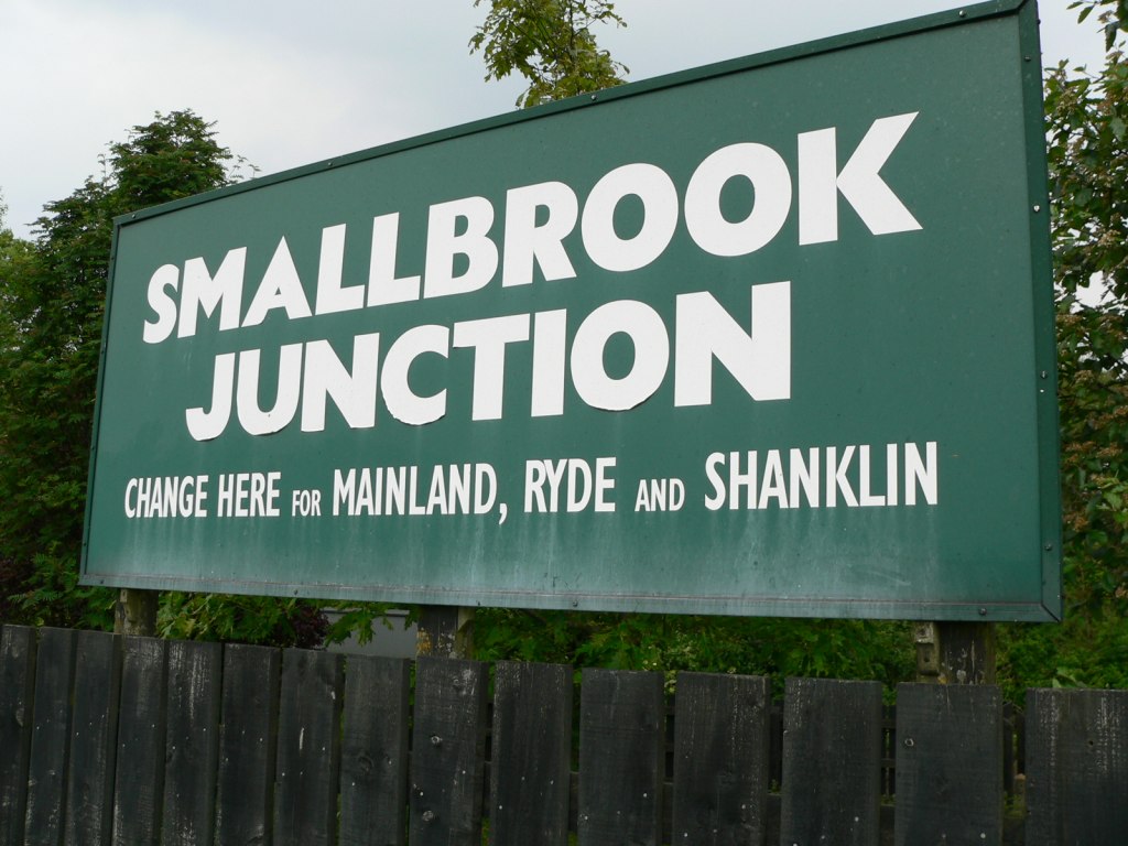 The station sign on the Island Line platform at Smallbrook Junction on the Isle of Wight. The entire purpose of this station, constructed in 1994, is to serve as an interchange between the two railways. There is no road or footpath access so the station is open only when both Island Line and Isle of Wight Steam Railway trains are operating.
