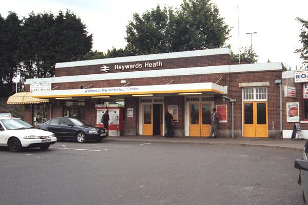 UK Railway Station, Haywards Heath, Sussex. Haywards Heath station on Sunday morning June 6th 1999. Haywards Heath is an important stop on the London-Brighton mainline. The first station was built here by the London & Brighton railway in 1841. It was here, in February 1858 that the London, Brighton & South Coast Railway (1846) detached the first ever passenger cars from a non stop express (slip coaches). This station building dates from the Southern Railway's 1932 750 V dc 3rd rail electrification project. Slip coaches were discontinued on the Southern with the arrival of the EMUs. This is the closest mainline station for the Bluebell Railway.