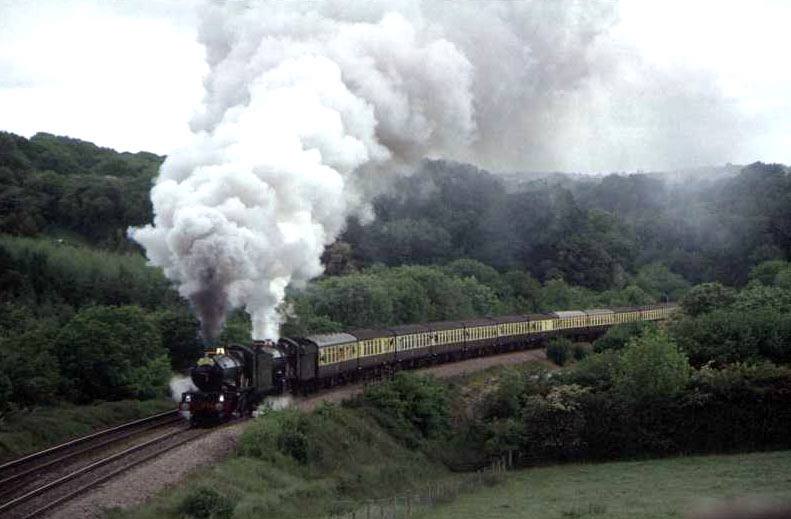 exhausts of ex-GWR 4-6-0s, 5029 Nunney Castle and 5051 Earl Bathurst hang in the