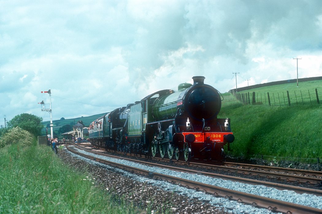 | 1306+45407_Hellifield_arrive. UK Heritage Steam 1960s and 1970s. On 19th June 1976, the LNER Society Railtours special train The Gresley Centenarian, is seen arriving at Hellifield behind B1 No.1306 Mayflower and LMS Class 5 No.45407. After a photographic stop the train will continue to Leeds. roger.griffiths@hotmail.com |