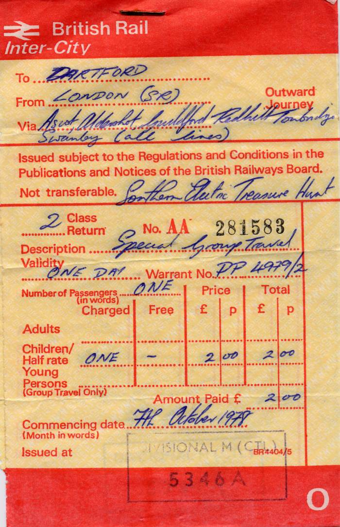 This ticket was issued to enable willing participants to follow clues in a Treasure Hunt organised by the SEG. The ticket says "To Dartford from London (SR) via Ascot, Aldershot,Guildford,Redhill,Tonbridge,Swanley (all lines)" The idea was to solve a clue and visit the location. The only clue I remember was "Ha Yes, this is the end of the line" We ignored the clues and used the ticket to travel around South london for the day! The cost was 2.00 child ticket and the date 7th October 1978 Scan by Squire, K (k.squire@virgin.net) Ken's Photographs |