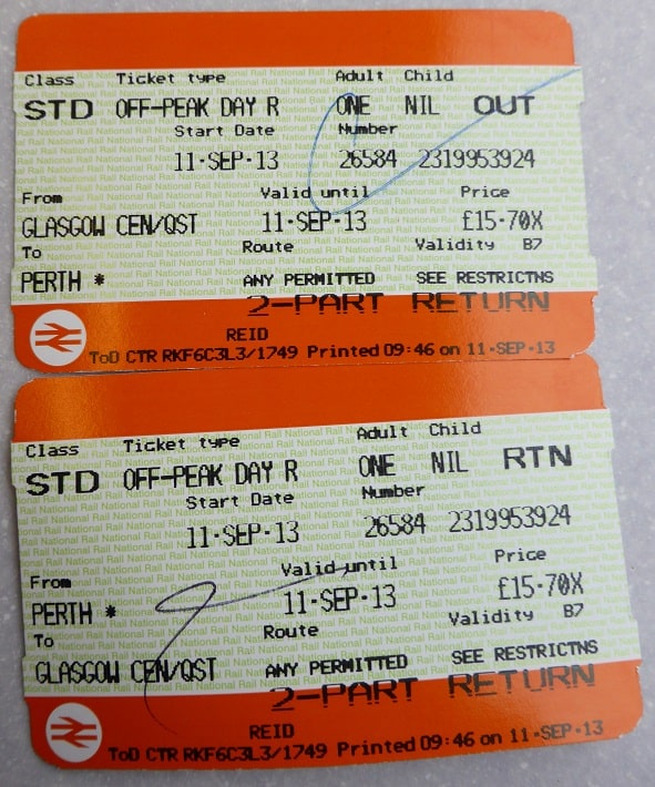 Off-peak day return ticket, valid for off-peak travel from Glasgow Queen Street to Perth and back on 11th September 2013.