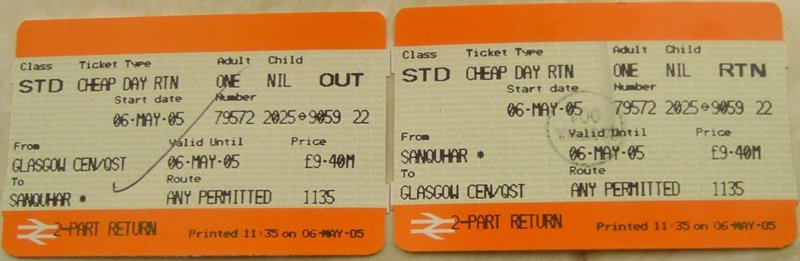 Cheap day return ticket, valid for off-peak travel from Glasgow Central to Sanquhar and back on 6th May 2005.