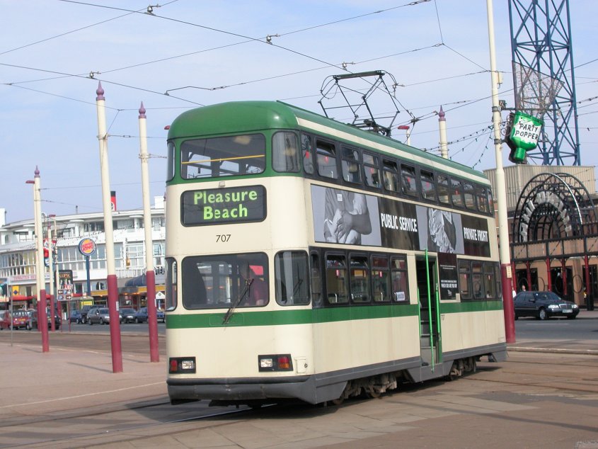 'Blackpool' Balloon Double Deck Car Although ten years separate these two Blackpool trams, which were built in 1934 (709) & 1924 (147), the modern look of car 709 suggests otherwise in this study taken at Blackpool's North Pier on Mon 7th May 2007 at 10:25. Built in 1934 was 'Balloon' Double Deck Car 709, which was one of twelve originally built to 'Open-Top' configuration but later rebuilt in 1941-42 with roofs. Very late on in it's working life around the turn of the Millennium, it became one of a handful rebuilt with modern looking flat fronts in place of it's sweeping curved front, and it is in this guise, while sporting an overall advert for Blackpool's Sealife Centre and bound for Cabin on Blackpool's north Shore, that it is seen while in the company of Standard Double Deck Car 147 'Michael Airey', which is now preserved.