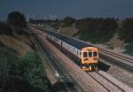 Serco DMU 101 passes through Stratford in the Spring of 1999. Note the middle car has a pantograph thats raised