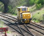 UK fast line working machine stands on platform 7 at Doncaster station and is looking for a place to do some repairing work.